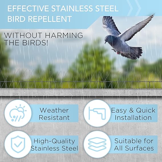 - PROTECT YOUR PROPERTY FROM UNWANTED BIRDS! Tired of cleaning up bird droppings and dealing with nesting pigeons or seagulls? AOKKR stainless steel bird spikes deterrent provide an effective solution to deter birds from landing on your roofs, fences, and windowsills, keeping your property clean and damage-free