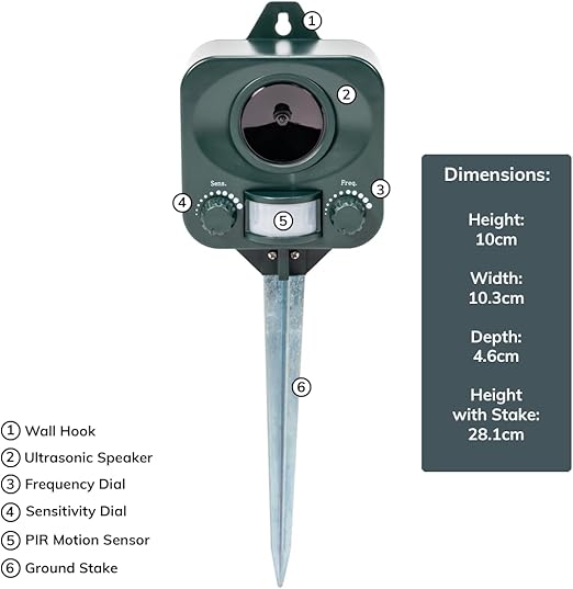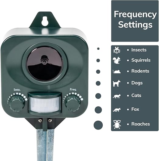 Effectively keeps cats, dogs, foxes, squirrels, rodents, and some insects out of your garden using a non-harmful ultrasonic method with fully adjustable sensitivity and frequency controls.