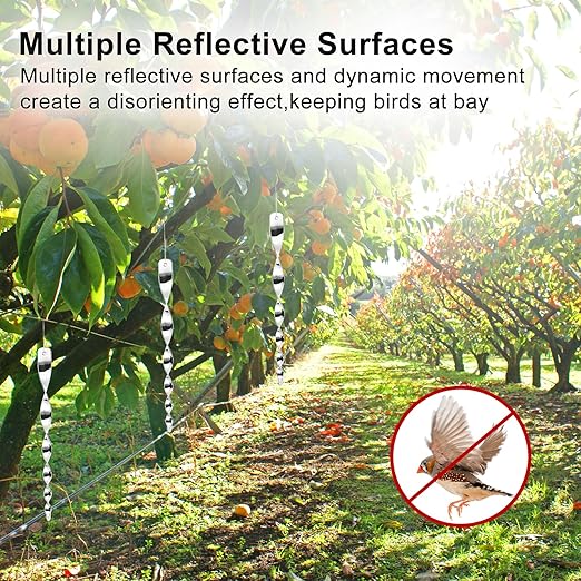 Each rod features multiple reflective surfaces that spin and shimmer in the breeze, creating a confusing, disorienting visual effect to keep birds away from targeted areas. Ideal for deterring pigeons, crows, sparrows, and other nuisance birds.