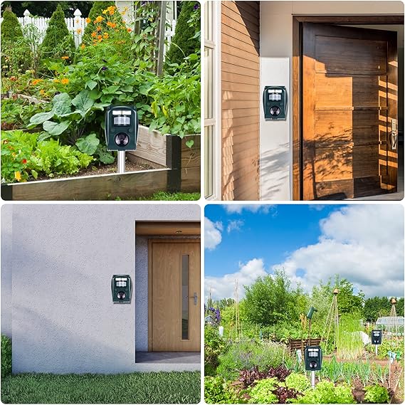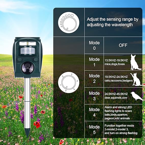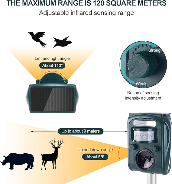 - Infrared Sensor: Infrared PIR motion sensor angle up to 110 degrees and detection range up to 10m away activating the animals repellent to emit a high frequency sound.