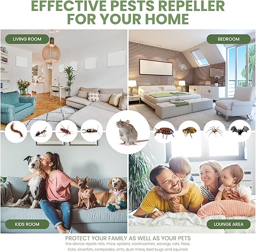 POWERFUL RODENT & INSECT REPELLER – Effectively drives away rats, mice, spiders, cockroaches, earwigs, fleas, ticks, silverfish, centipedes, ants, dust mites, bed bugs, and even squirrels.